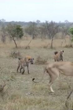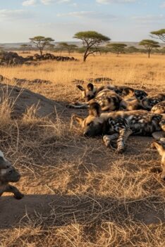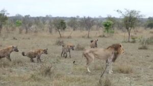 Old male lion being followed by a hyena clan The Elder Lion’s Shadow The once-mighty lion, his mane thinned and gait unsteady,...