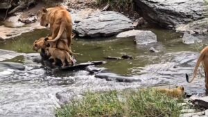 Lion cubs crossing a river for the first time