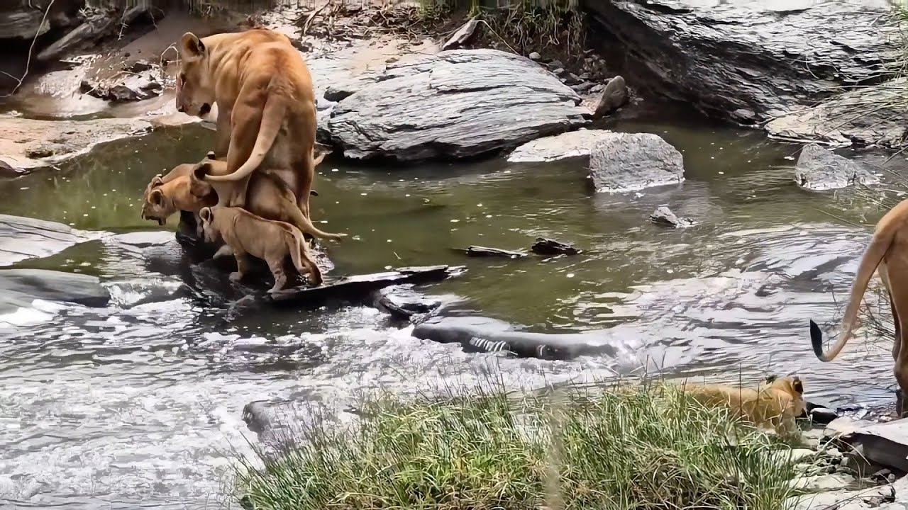 Lion Cubs Brave Their First River Crossing Under the watchful gaze of their pride, a litter of lion cubs hesitates at the riverbank....