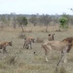 An old lion gets arthritis in its joints. It no longer has the strength or speed to catch its prey. Slowly the lion becomes malnourished. The lion grows weak and dies. Hyenas are good at telling when an animal is sick or weak and are hot on this lions tail.